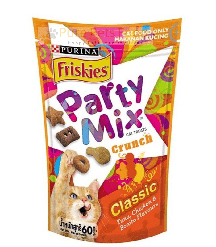 - Treat your cat to a flavorful delight with Purina Friskies Party Mix Classic Cat Treats.